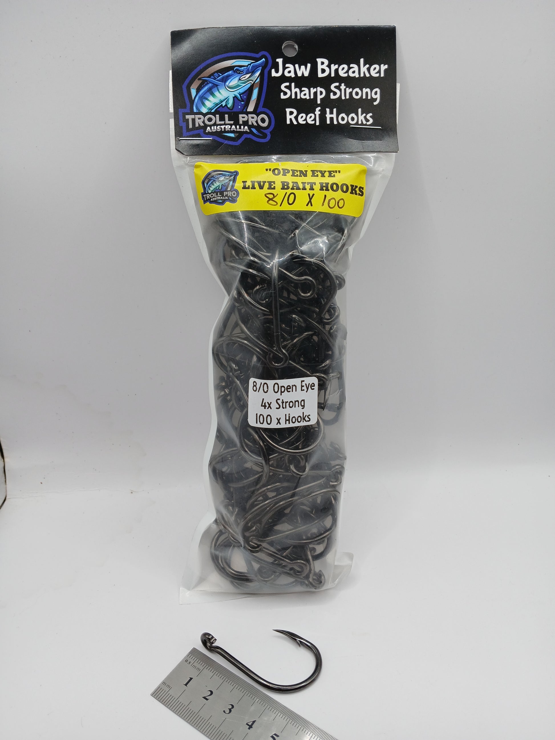 Jaw Breaker open eye Are 4 x Strong, Black Nickel coated,Heavy Duty Reef Hooks ,Forged Chemically Sharpened point and Super Strong.Open eye to suit all your ganging needs,these hooks will never break closing the eyes which will save you money and fish.They are ready for any heavy action on the water. Bag of 100 Hooks