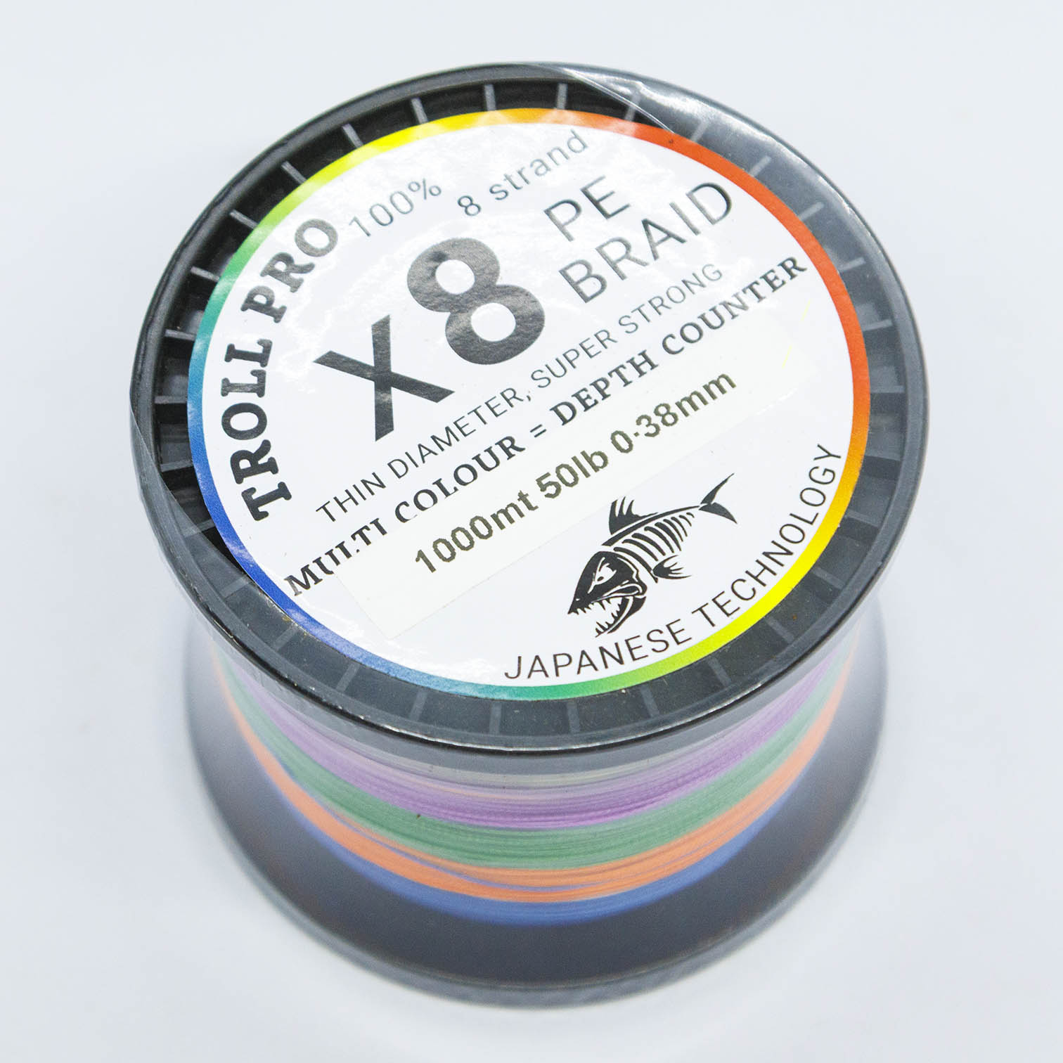 1000 meter spool of 60 pound PE 8 strand depth counting multi coloured braided fishing line.Our selection of multi coloured 8-strand braid fishing lines is stronger, smoother, quieter, thinner and well-castable, here’s why 8-strand braid fishing line is a popular choice for its exceptional strength and performance,the 8-strand fishing braid consists of eight interwoven polyethene fibres, which enhances its durability and smoothness. This construction provides a notable increase in sensitivity and casting distance, making it easier to detect bites and make accurate casts. Whether you’re fishing in freshwater or saltwater, the 8-strand braid fishing line offers a reliable solution for various fishing conditions. Its strength-to-diameter ratio allows you to use a thinner line without sacrificing power, giving you a competitive edge on the water.These Troll Pro 1000 meter spools are great value for money.